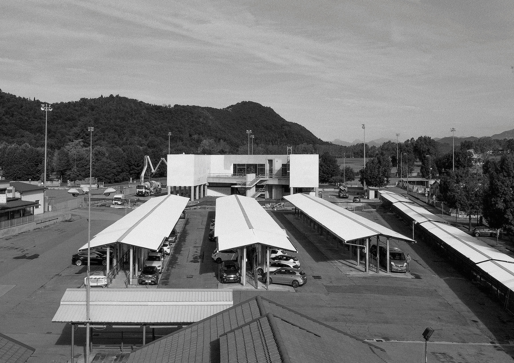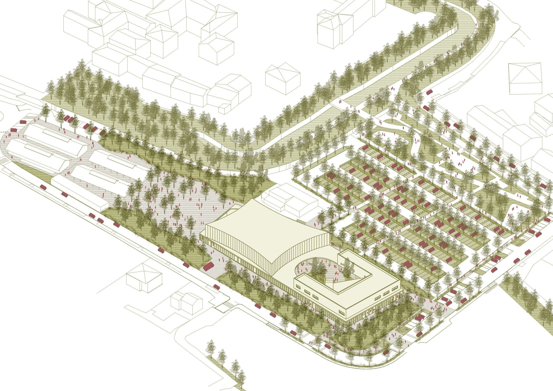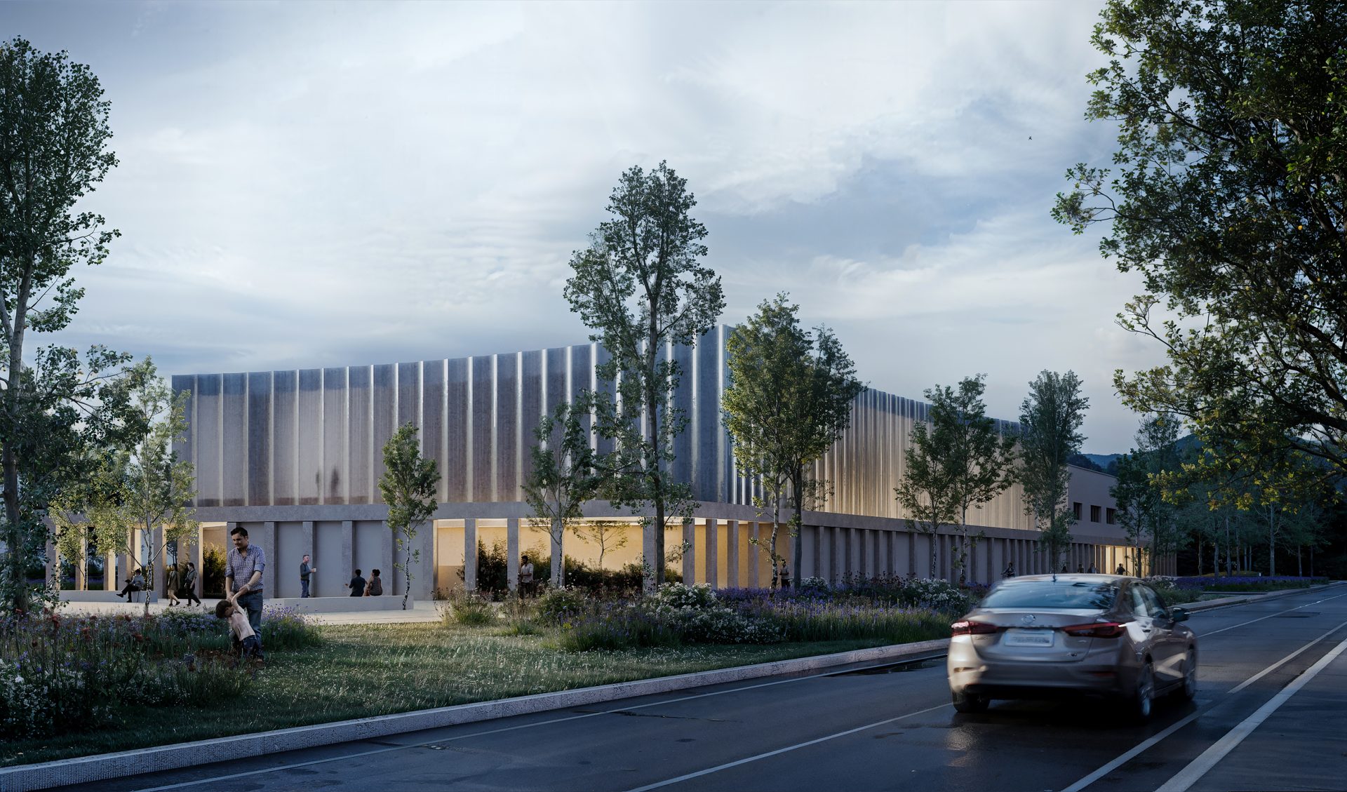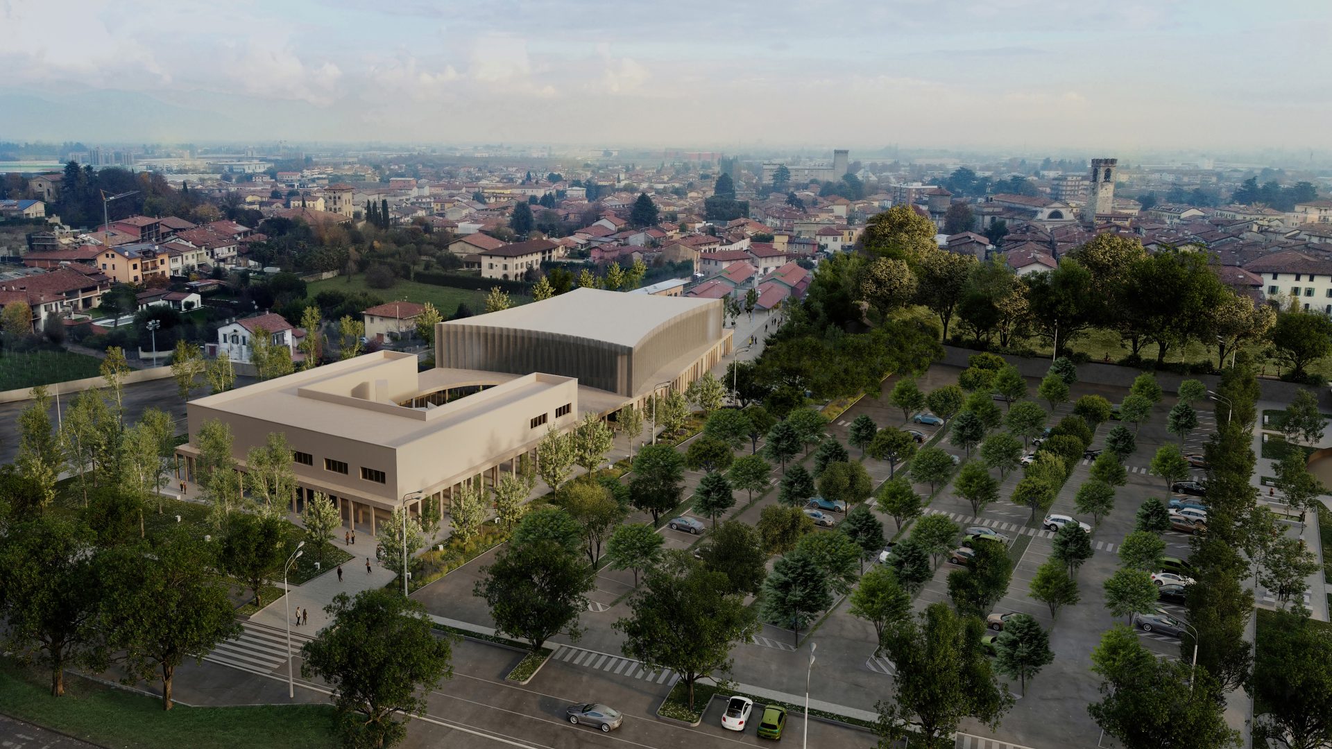 The project is located in a strategic position between the built city and the landscape of Mont’Orfano, intervening in an area that is currently fragmented and introverted. The intervention takes the form of an urban regeneration strategy, transforming a closed enclave into an open and permeable system capable of reactivating relationships between the city, public spaces, and the surrounding landscape. The removal of physical boundaries and the introduction of a pedestrian boulevard generate a new urban infrastructure, organizing a coherent system of open and built spaces. Vegetation becomes an integral part of the project, contributing to the construction of a continuous landscape in dialogue with its context and existing systems. The new building is conceived as part of this system: a permeable portico embraces the existing structures and defines a public threshold, while the auditorium volume emerges as a contemporary landmark, capable of interpreting the site’s stratification without overwhelming it.