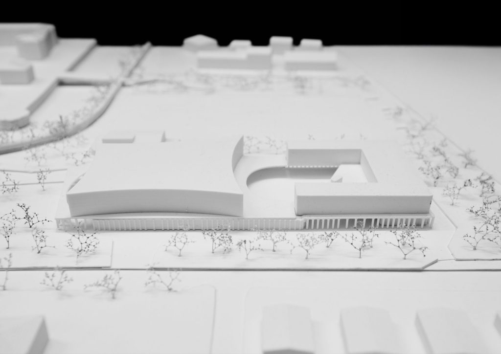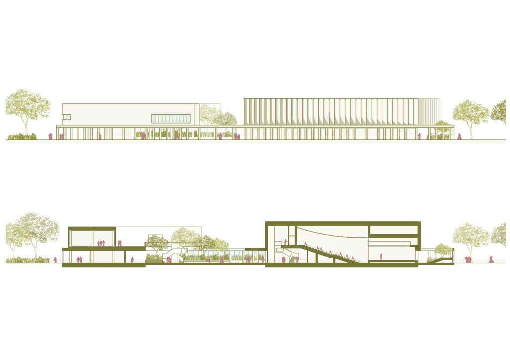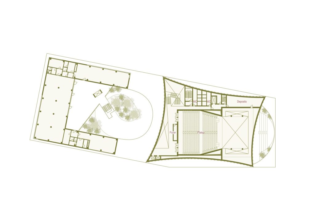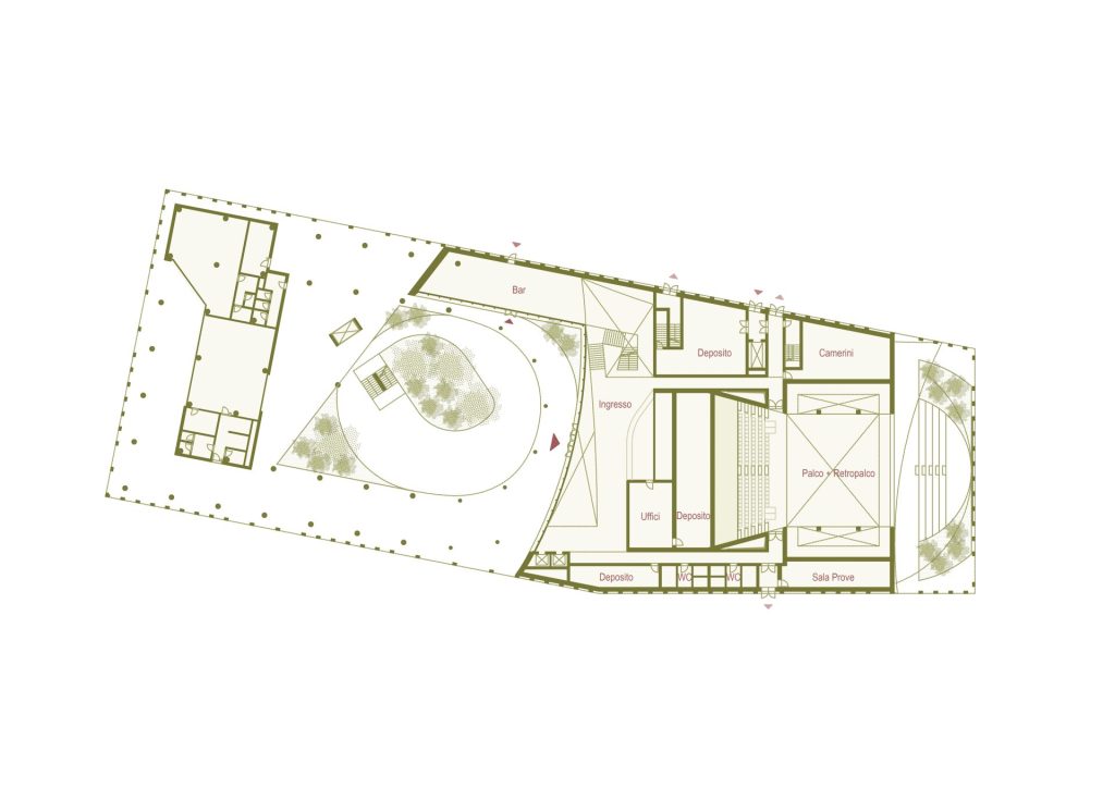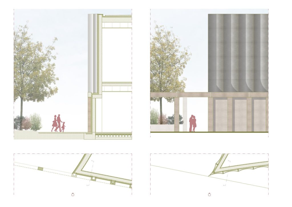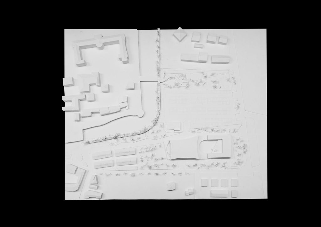 The project is located in a strategic position between the built city and the landscape of Mont’Orfano, intervening in an area that is currently fragmented and introverted. The intervention takes the form of an urban regeneration strategy, transforming a closed enclave into an open and permeable system capable of reactivating relationships between the city, public spaces, and the surrounding landscape. The removal of physical boundaries and the introduction of a pedestrian boulevard generate a new urban infrastructure, organizing a coherent system of open and built spaces. Vegetation becomes an integral part of the project, contributing to the construction of a continuous landscape in dialogue with its context and existing systems. The new building is conceived as part of this system: a permeable portico embraces the existing structures and defines a public threshold, while the auditorium volume emerges as a contemporary landmark, capable of interpreting the site’s stratification without overwhelming it.