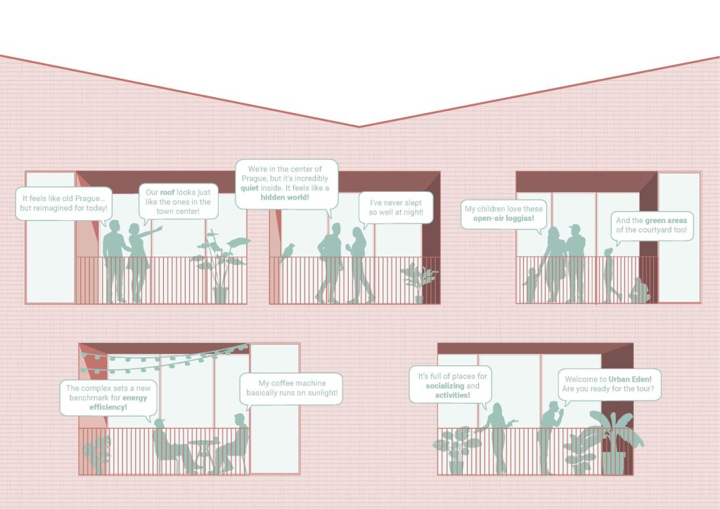 Urban Eden is an urban project that offers a contemporary interpretation of Prague’s historic fabric, taking shape within a masterplan as an open and permeable urban block. The architecture engages with the city’s layered character, redefining the skyline without breaking its identity, instead projecting it toward the future. The masterplan introduces public and shared spaces—porticoes, green terraces, and an inner courtyard—and prioritizes durable, locally rooted materials, such as brick and recycled aluminum. At the heart of the project lies the quality of living, enhanced by community-oriented shared spaces and integrated digital services. Conceived as a benchmark for sustainable living in a strategic urban location, Florenc21 adopts advanced energy solutions and an innovative construction system that combines architectural lightness, residential flexibility, and the use of hybrid structures, including timber. Urban Eden aspires to become a new urban icon for Prague: a recognizable project that brings together architecture, sustainability, and contemporary identity.